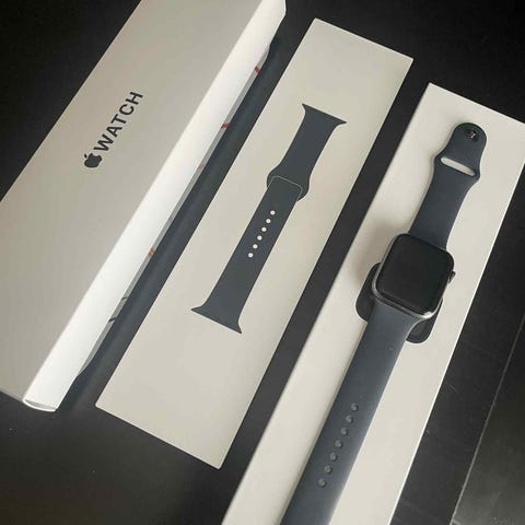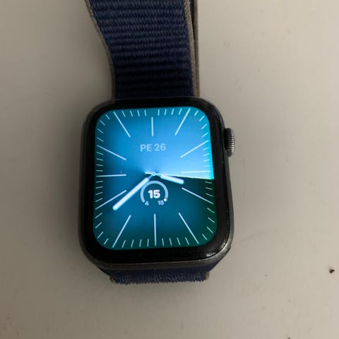 Apple Watch älykello, jossa sininen ranneke. Kellonäyttö on neliömäinen ja laite on tarkoitettu ranteeseen kiinnitettäväksi älykellona. Ranneke on valmistettu joustavasta materiaalista, sopii päivittäiseen käyttöön ja tarjoaa älykkäitä toimintoja ajan näyttämisen lisäksi.