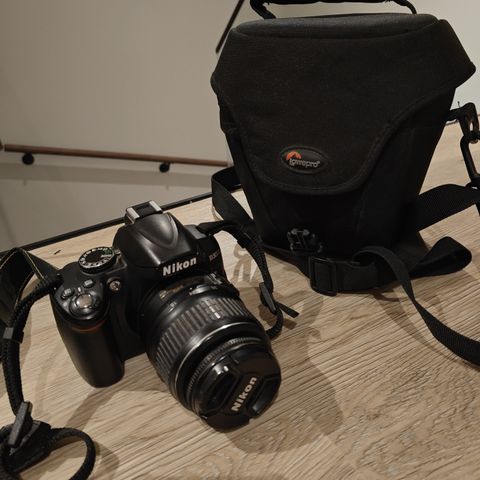 Nikon järjestelmäkamera, mukana kaksi objektiivia (toinen pitkä tamron zoom-objektiivi ja toinen perusobjektiivi), kamerahihna, akkulaturi ja kantolaukku.