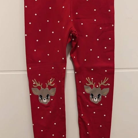 Myydään siistit yhden joulun käytössä olleet hm leggarit jouluun. Koko 110. Vyötäröllä kiristyksen säätö. Jotain pientä tahraa saattaa olla.
