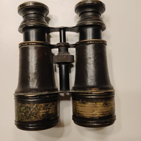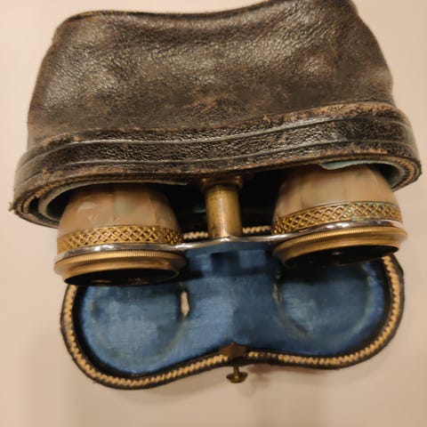 Kompaktit vintage-kiikarit joissa on valkoinen runko ja kultaiset yksityiskohdat. Mukana musta kantokotelo.