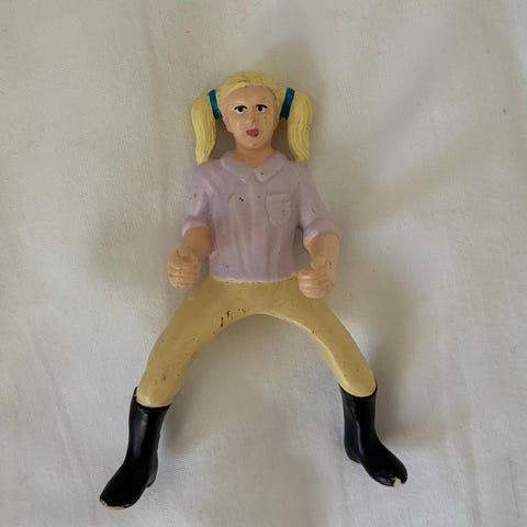 AI: Schleich ratsastajahahmo lasten lelu. Hahmo on suunniteltu lasten leikkeihin ja se esittää ratsastajaa. Värit sisältävät vihreän takin, ruskeat housut ja mustat saappaat.