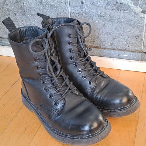 Maiharityyppiset nilkkurit, joissa sisäsivulla vetoketju sekä päällä nauhakiinnitys. Päällinen aitoa nahkaa ja sisällä lämmin keinoturkisvuori. Ihanat talvikengät, mutta itselle oli liian kapea lesti.