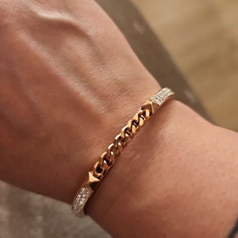 Kaunis kullanvärinen rannekoru zirkoneilla. Ruostumatonta terästä. Myytävänä myös muualla.