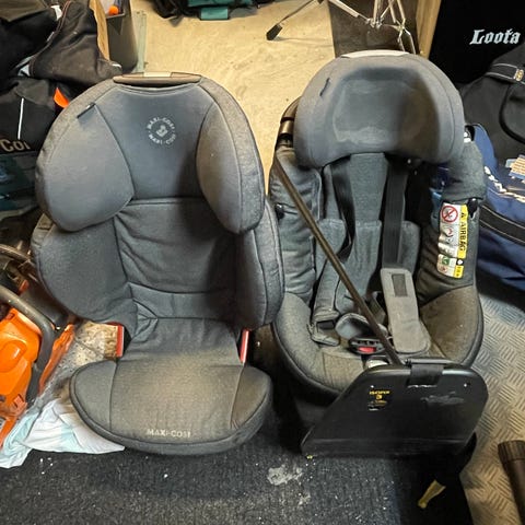 Vaalea Maxi Cosi ja sininen Graco, -10-13kg. Siniseen mukaan alus telakka. Voi käyttää mm. kätevinä sittereinäkin.