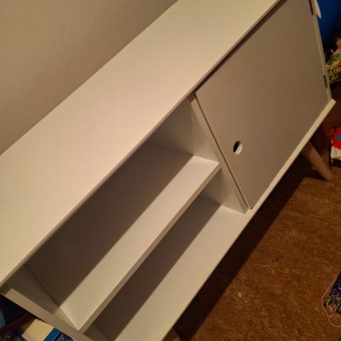 Rottinki lipasto. Yhdessä hyllyssä vikaa ja pöytä levyssä värjäymää.
