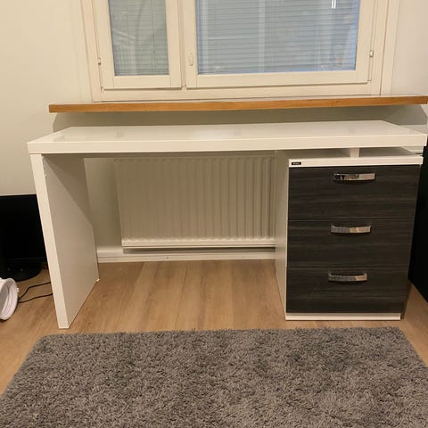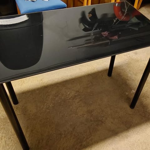 Myydään tukeva musta pöytä, ei heilu. Jämäkkyydestäån huolimatta siron näköinen ja siisti. Kansi jämäkkää 2,7 cm paksua lastulevyä, joka päällystetty mattamustalla DC-Fixillä. Alunperin taisi olla vaaleankeltainen. Jalat ja kehikko maalattu kalustemaalilla mustaksi. Alunperin oli ehkä ruskea.