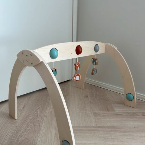 Myynnissä vauvan lelukaari. Pehmeät kaaret. Ympyrän halkaisija 90 cm ja korkeus 55 cm. Yksi lelu puuttuu kaaresta ja matossa ollut lelupeili hukkunut. Kanto kassi mukana.