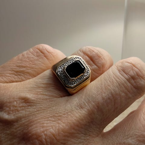 Upea kultasepällä teetetty sinisafiiri 14k kultasormus, mallia kanta/ammattisormus, mutta isolla safiirilla.