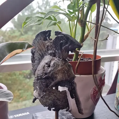 Alttarin pronssinen naamio, Sao-heimosta, Nigeriaa kotoisin. Kauniin valukappaleen laatu ja täydellinen tummunut patina tekevät tästä esineestä taideteoksen, unohtamatta animistista kuvausta ihmisestä, joka tarttuu puolustuksiin, mikä on merkki voimasta esineen haltijalle.