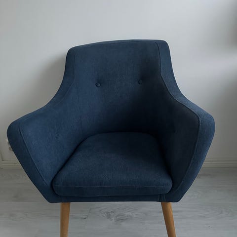 Hakusanat: lepotuoli, moderni, huonekalut, hyväkuntoinen, Valmistaja, kangasverhoilu, minimalistinen, metallijalat, käytännöllinen, 2000-luku, käytetyt huonekalut, yksinkertainen, kuluma, sininen, selkeät muodot, sisustus, nojatuoli