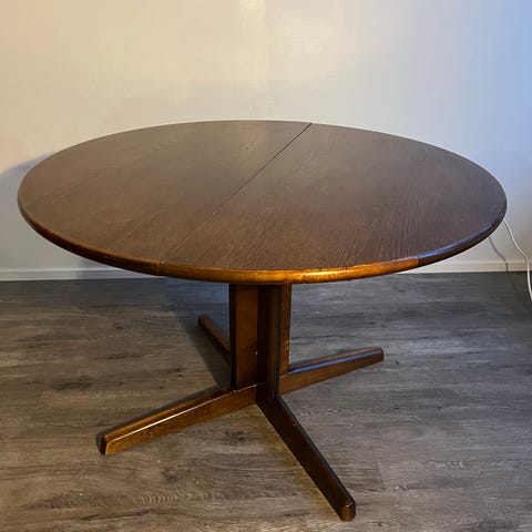 Pyöreä retro ruokapöytä, joka on maalattu valkoiseksi. Pöydän jalat ovat tukevat ja ristikkomalliset, mikä antaa sille vakautta ja kestävyyttä. Halkaisija 90cm ja korkeus hieman normaalia matalampi 68cm.