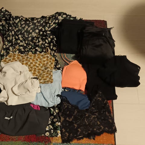 Vaatepaketti sisältää mm. Bikinit, mekko, hame, neuleen, hupparin, paitoja, farkut, toppatakki, ulkoiluhousut, aamu/kylpytakin. Kissa talous!