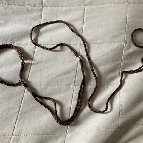 Pienen koiran näyttelytalutin ketjukaulaimella. Nyloninen talutinosa, jonka päässä käärmeketju puolikiristävänä. Taluttimen koko pituus noin 130cm. Pantaosa pienimmillään (pelkkänä ketjuna) noin 25cm ja isoimmillaan noin 37cm.