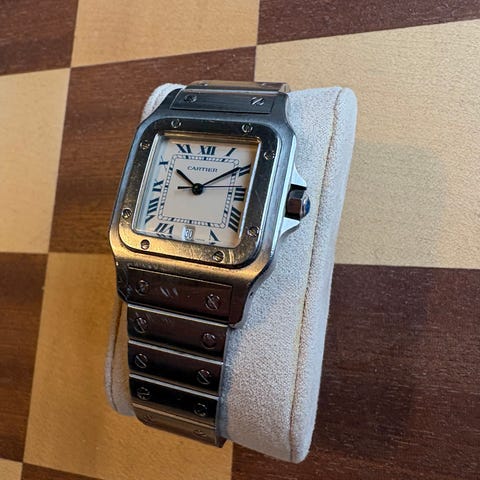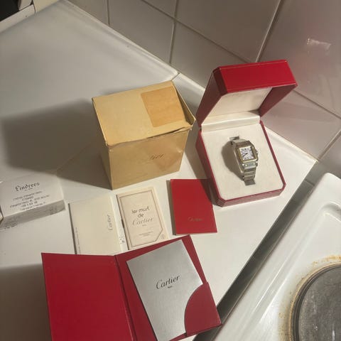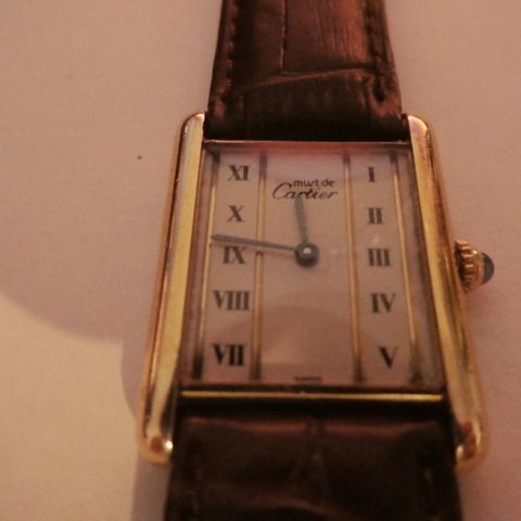 Myydään Cartier Vermeil rannekello. Koneisto huollettu 2024 Helsingissä Lindroosilla ja samalla vaihdettu uusi Cartierin alligaattorin nahkainen musta ranneke sekä vetonuppi ( 400€).