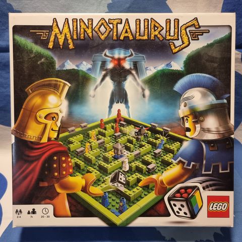 LEGO Minotaurus lautapeli, malli 3841. Sisältää pelilaudan, nopan ja pelinappulat. Pelissä pelaajat liikkuvat labyrintissä pyrkien välttämään minotaurusta. Sopii useammalle pelaajalle.