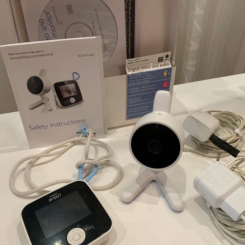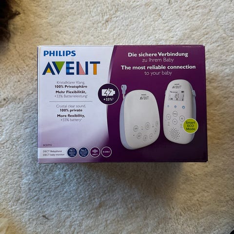 Philips Avent Vauvanvahti, langaton digitaalinen laite, sisältää vastaanottimen ja lähettimen. Käytetty äänen siirtoon ja vauvan tarkkailuun. Väri valkoinen. Mukana virtalähteet.