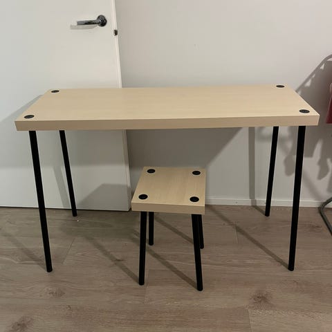 Nopeimmalle. Erittäin lujaa tekoa oleva kirjoitus-/työpöytä. Pöytä tasossa kaksi tehtyä reikää perhonsidontaa varten. Esim. autotalliin työpöydäksi tai ompelijalle.