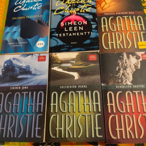 Kaapin kätköistä kovakantisia dekkareita. Pientä sanomista näissä on mutta hyvin näitä lukee vaikka päällipaperissa saattaa olla kulumaa ja jossakin omistajan nimikirjoitus. 3 e/kpl. Ilmoita mitkä haluaisit. Nouto Turun keskustasta onnistuu mutta myös postitus. Mukana seuraavat kirjat: Totuus hallavan hevosen majatalosta, Kuolema ilmoittaa lehdessä, Salaperäiset rukiinjyvät, Aikataulukon arvoitus, Määränpää tuntematon, Rakkauskirjeiden salaisuus, kaksoiskappale Bertramin hotellissa/Vuoksi ja luode.