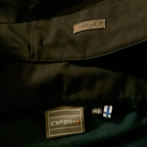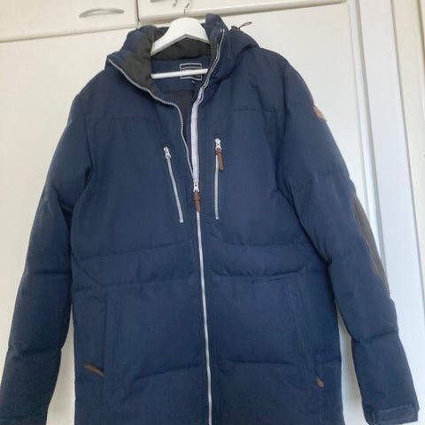 tummansininen,jossa mustalla ja tummanharmaalla kuvio,kiinteä huppu,hihansuissa tarrasäädin,vetoketju taskut,helmassa säätönarut lukolla,kevyt toppaus.postit 9e tai matkahuolto.