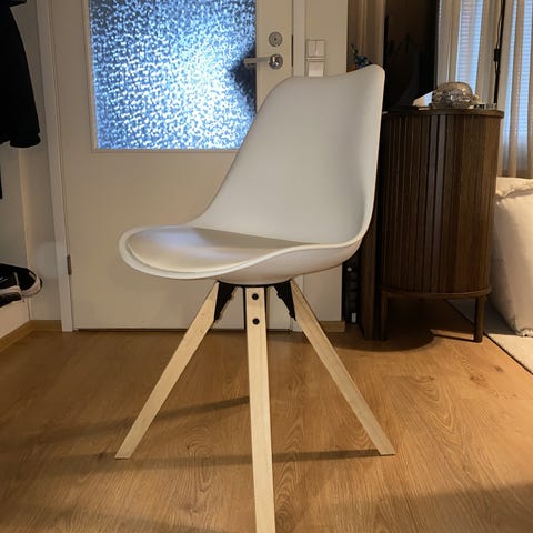 Valkoisia ruokapöydän tuoleja 4 kpl. Ostettu aikoinaan Vepsäläiseltä. Oivallisia istua. Istuinkirkeus n. 48 cm.