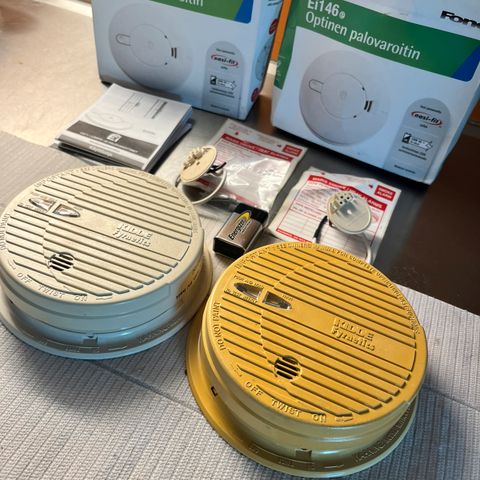 Kaksi uutta Airam optista palovaroitinta paristoineen ja yksi käytössä ollut ilman paristoa. Hinta yhteensä 10€.