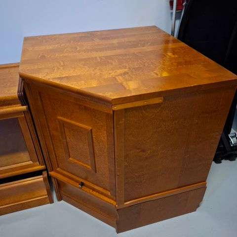 Kirsikan värinen elementtihylly. 3 vetolaatikkoa, 2 sokkelilaatikkoa, mappikaappi, 4 kpl lasiovellisia kaappeja ja 4 umpiovellisia. Valmistettu koivusta ja koivuvanerista, joka petsattu.