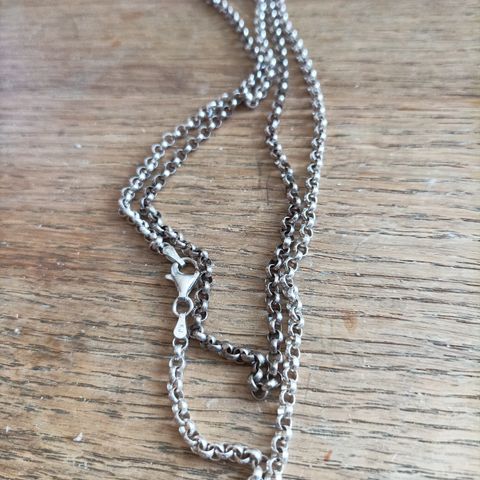 Hopeinen kaulaketju. Pituus n. 70 cm, leveys n. 5 mm, paksuus n. 2 mm. Pari kertaa käytetty. Uusien vastaavien hintoja voi kauhistella netissä! Vain nouto Suomussalmi kk!