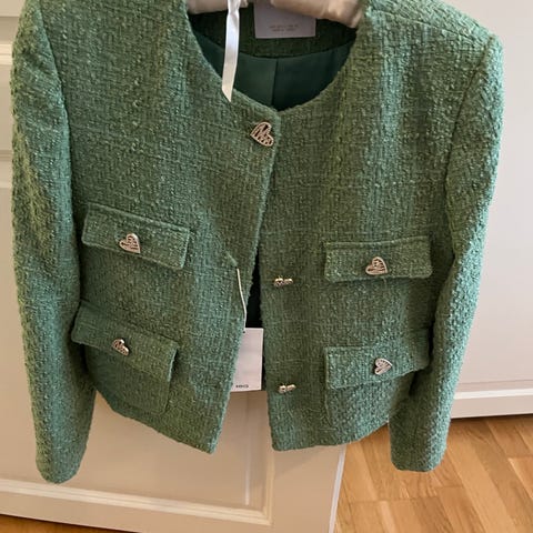 Mango luonnonvalkoinen eläväpintainen tweed bleiseri. Edessä vetoketju. Kevyet olkatoppaukset. Lyhyt malli. Materiaali 62 % puuvillaa