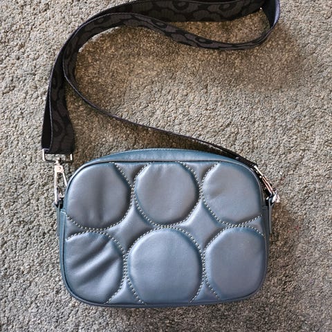 Laukussa on musta unikko kuviollinen olkahihna ja hopean väriset metalliosat.