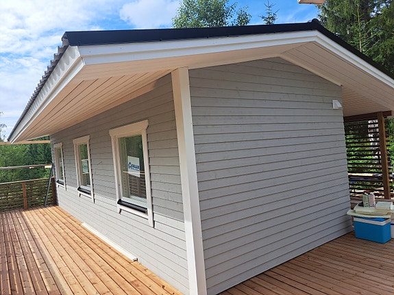 Ulkoseinät- ja päädyt tehty pohjamaalatulla vaakapaneelilla ja ovella. Räystäslistoitukset mustalla pellillä. Yleensä sivuräystäät tehdään vasta asennuspaikalla jotta ne eivät hajoa kuljetuksessa.