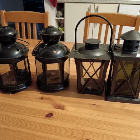 Myydään kullanväriset lasikuvulliset kynttilä /koristelyhdyt. Näitä on kaksi kpl, 23.5 cm ja 18 cm korkuiset. Käytetty juhlasomistuksessa. Kynttilät ei myynnissä.