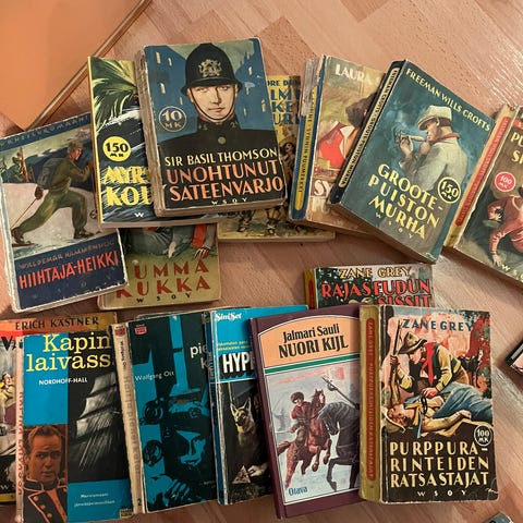Huom. kirjojen kunto vaihtelee. Kaikki kirjat ovat lukukelpoisia ja yleiskunto hyvä, mutta osa kirjoista on esim. kulunut reunoista, kulmista, kansista, paperikansista, tehty joitakin merkintöjä kynällä, liimatarran jäki kirpputorilta, paperikannet puuttuvat, hieman taipuneet yms. En erittele myynti-ilmoitukseen jokaisen kirjan kohdalle sen kuntoa. Lisätietoja tietyn kirjan/kirjojen kunnosta saat kysymällä.