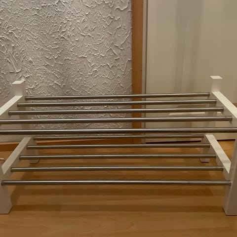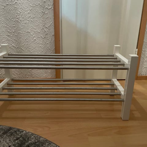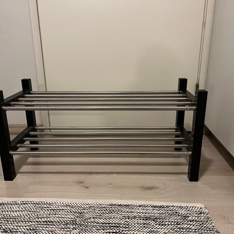 Myydään harmaa kaksikerroksinen kenkäteline, noin 90cm leveä. Nouto Kuokkalasta.