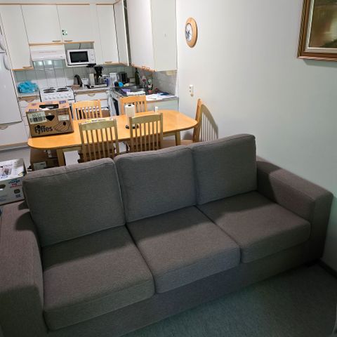 Roosan värinen sohva, 3 istuttava, pituus 176cm.kotimsinen, tehty Askon tehtaalla, 10v. Takuu rungolla, valkoiset puu jalat, mukana myös niskatyyny.