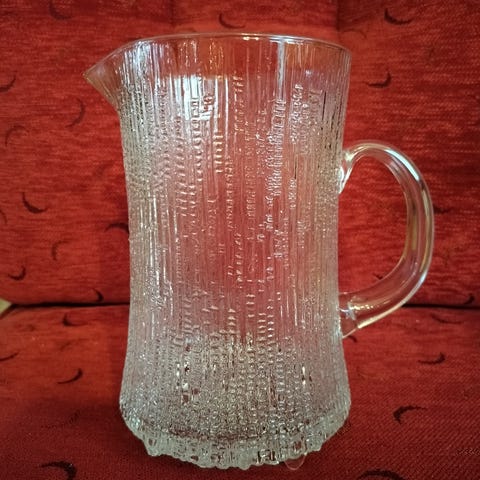 Nyt tarjolla Iittalan klassikko kaadin/ kannu. Ikävä kyllä kannun kahvan kiinnityksen kohdalla on halkeamat. Huomasin vasta nyt kun askartelin myynti-ilmoitusta, en ole käytössä asiaa huomannut. Tarjoa jos hintapyyntö ahdistaa ja hae pois.