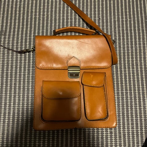 Materiaali upeaa vanhaa nahkaa, soljissa ja lukossa patinaa. Yksi vetoketjun vedin puuttuu mutta toimii, kangasvuoressa tai saumoissa saattaa sojottaa langanpätkiä. Muuten moitteettomassa kunnossa