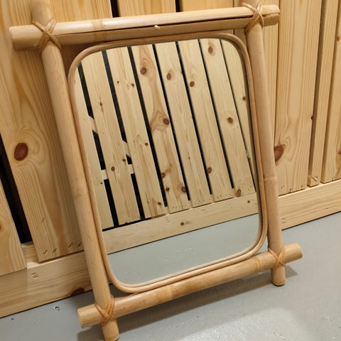 Peili, jossa on puinen kehys. Peilin kehys on valmistettu luonnonpuusta ja siinä on rustiikkinen ulkonäkö. Sopii seinäpeiliksi sisustukseen.