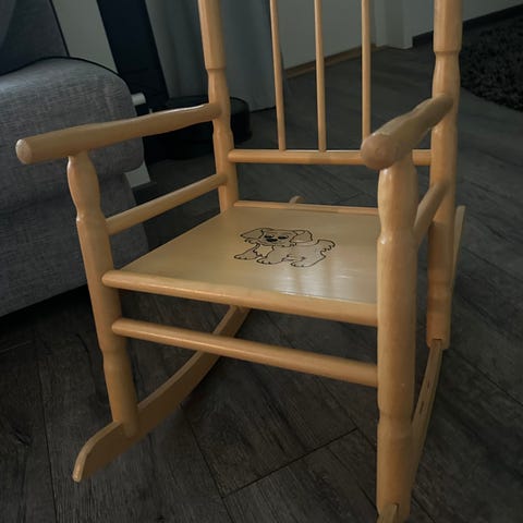 Ainutlaatuinen lasten keinutuoli, punottu puuvillanarusta. Istuinosan koko 27 × 27 cm.