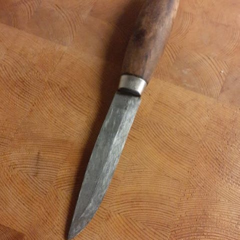 Puukko, jossa on nahkatuppi. Kahva ja tuppeen koristelu ovat ruskeat. Terä on metallinen. Erik Frost, Mora, Sweden
