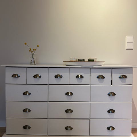 Vanha täyspuinen apteekissa ollut laatikosto. Ikäisekseen hyvässä kunnossa, yksi vedin irronnut. Lakkapinta. Toinen reuna on ”käsittelemätön”. Ollut meillä seinää vasten. Alun perin siinä on ollut kiinni ehkä toinen osa. Katso kuva.