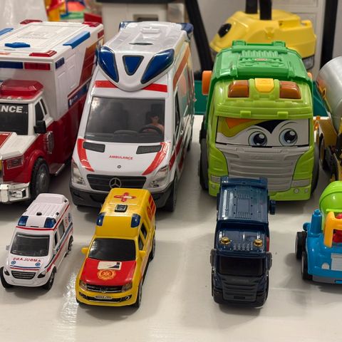 Pieni rekka, jossa molemmilla puolilla luukut autoille sekä 6 pikkuautoa. Pientä leikin jälkeä autoissa, mutta siisti paketti.