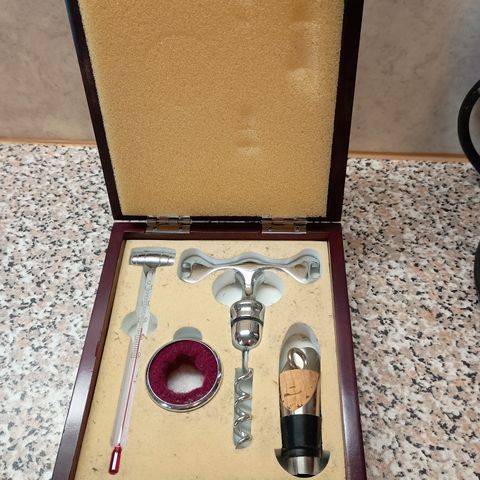 Myydään lahjaksi saatu viinitarvike setti 5 osainen . UUSI käyttämätön paketissa. Pakkaus sisältää korkkiruuvi,tippalukko,viinikorkki,kaatonokka ja lämpömittari.