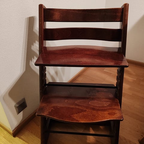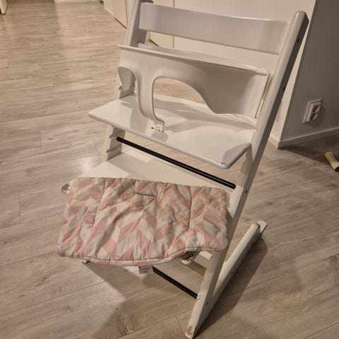 Stokke tripp trapp tuoli. Mukaan tulee turvakaari (haarahihna puuttuu) ja baby setin selkänoja.