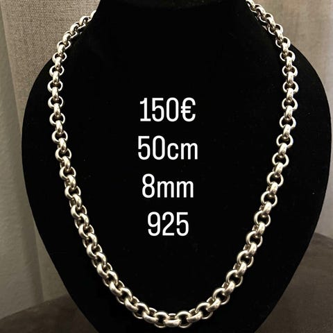Upea ketju riipuksilla, mukaan tulee koruliikkeen rasia, jossa pientä lohkeamista muttei vaikuta yleisilmeeseen.