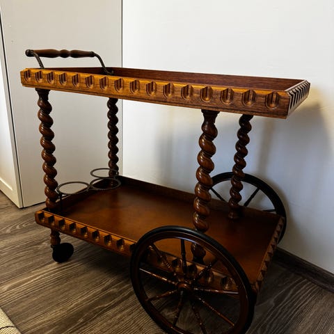 Tarjoilukärry, jossa on kaksi tasoa ja pyörät helppoon liikutteluun. Vaunun pinnat ovat tumman puun sävyiset ja runko messinkiä. Varustettu kahvalla ja pullotelineellä. Pulloteline on hieman vääntynyt, mutta muuten kärry on erinomaisessa kunnossa.
