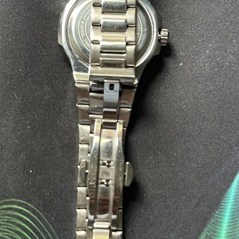 Hyväkuntoinen quartz kello teräsranneranneke. Kellon kuoren leveys nupin kohdalta 3,6 cm ja korkeus 4 cm.
