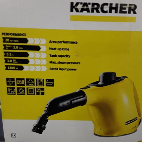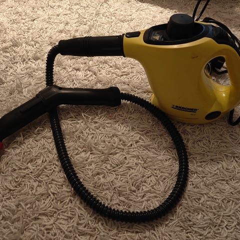 Kärcherin höyry lattiapesuri. Mukaan runko, pestävät ja uudelleenköytettävät luutut. Niissä hieman tummentumaa käytöstä, edelleen hyvin toimiva. Ohjekirja mukaan jos sen satun vielä löytämään, löytyy myös varmasti netistä. Ainoastaan nouto.
