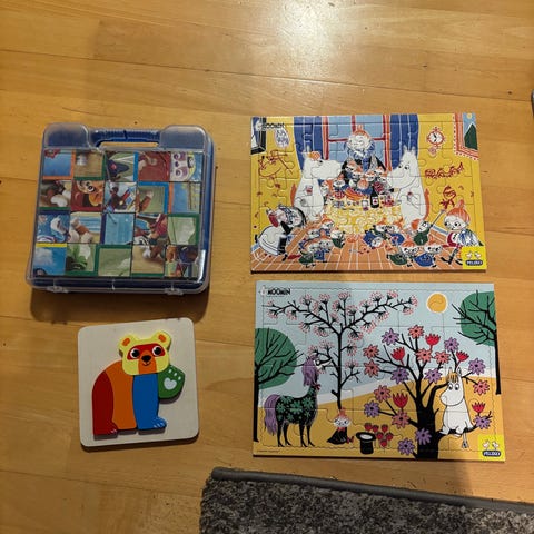 Kokoelma lasten palapelejä ja kirjoja, sisältäen Maailman lapset -aiheisen palapelin ja erilaisia lastenkirjoja. Palapelit ja kirjat sopivat lapsille ja tarjoavat viihdyttävää ja opettavaista sisältöä.