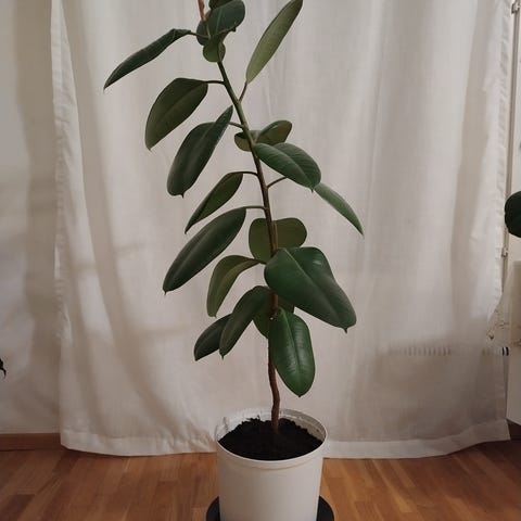 Myynnissä Ficus elastica (kumiviikuna) noin 170- 175 cm, sekä iso, pyörällinen kukkaruukku vedenpoistolla.