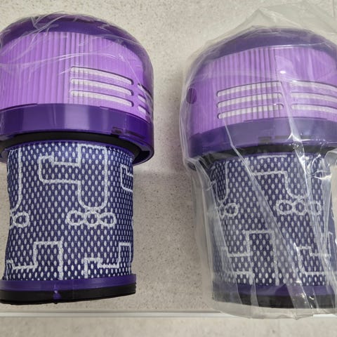 2kpl tarvike suodattimia Dyson V11 ja V15 imuriin. Voi pestä kylmällä vedellä. Dysonin omaan suodattimeen eron huomaa lähinnä tuosta kirkkaan muovin laadusta, että se ei ole niin eheän näköinen.